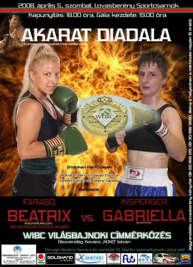 A shotokan küzdelmektől a K1-en átvándorolva a thai boxig mindkét nem képviseltette magát,akadt tehát látnivaló bőven.Záró akkordként az est fénypontját mégis egy női profi ökölvívó világbajnoki cím alkotta.A W.I.B.C.égisze alatt zajlott légsúlyban -50.8 kg kategória- két főszereplő hölgye a soproni illetőségű Faragó Beatrix{Betti} valamint a román színekben induló ,de magyar ajkú lány Insperger Gabriella voltak,kik a kemény tíz menet alatt nyújtottak bőven izgalmas perceket rajongóiknak.